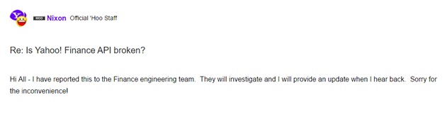 This resulted in a flood of forum posts asking when the API would be available again, to which Yahoo had no response. Finally after two days of the outage a Yahoo moderator finally chimed in on one of the forums.